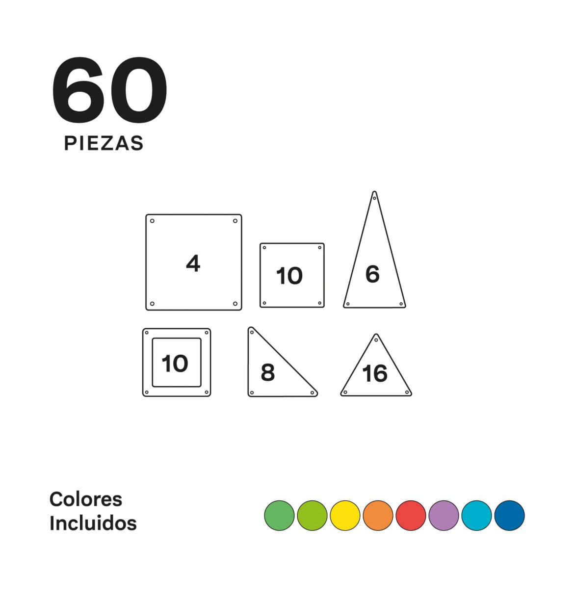 - Número de piezas: 60 bloques magnéticos de variadas formas y colores.